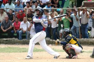 Tony Batista al momento de disparar un cuadrangular en el estadio de Bonao Bonao.- …